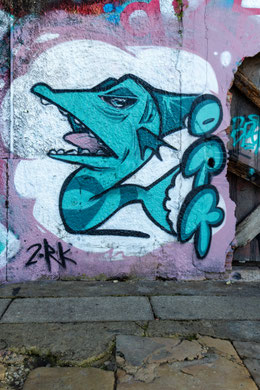 Mit dem Bus ging es zurück zum Hafen, wo wir die Graffitis entlang der R. do Ginjal betrachteten. Gleichzeitig bietet der Weg einen schönen Blick über den Tajo nach Lissabon.